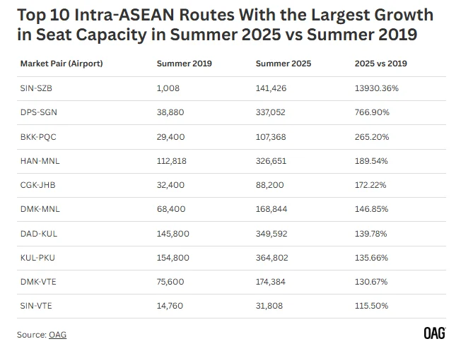 Analysis of airport pairs within the region reveals 50 new intra-ASEAN connections in Summer 2025 compared to Summer 2019, with the highest growth coming from connections between secondary cities.